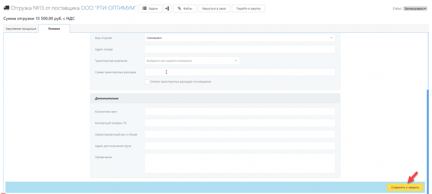 - Нажмите "Сохранить и закрыть" и задача об отгрузке будет автоматически создана
