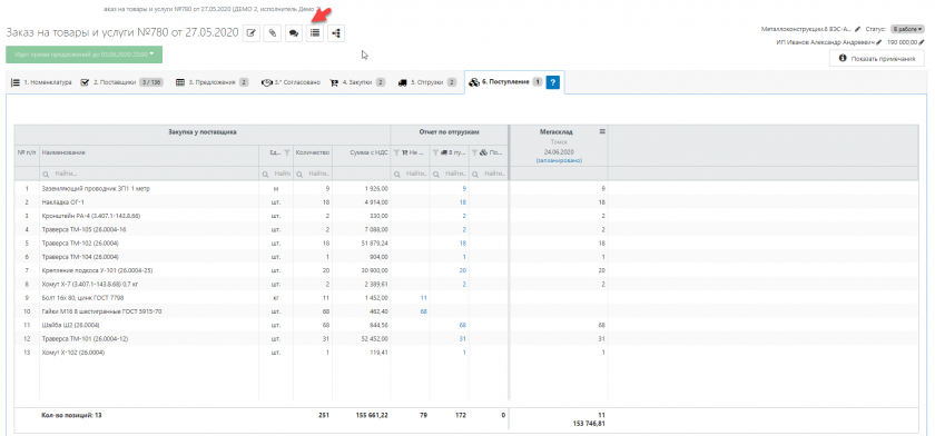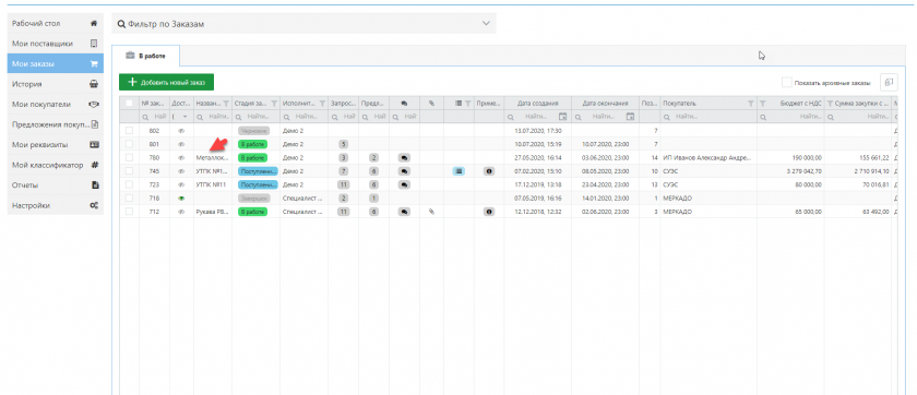 - Задачи, связанные с закупкой, можно увидеть на вкладке "Закупка у поставщика" в шапке столбца с поставщиком