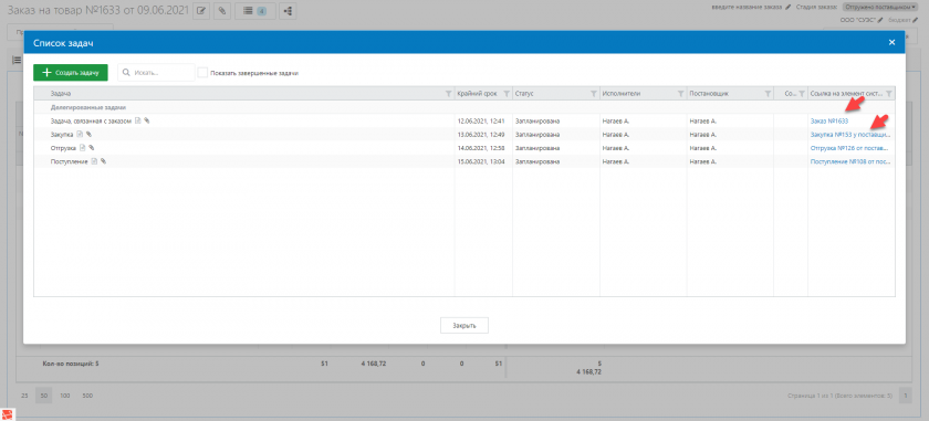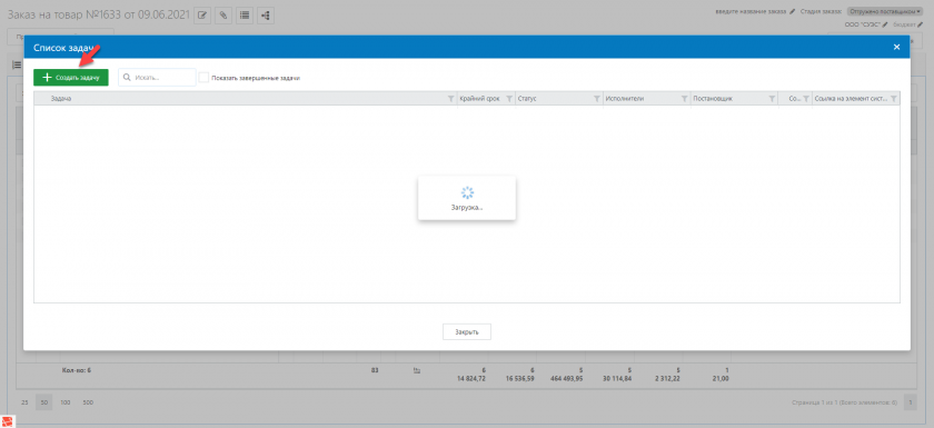 - Для создания задачи, связанной с заказом, нажмите на "Задачи"