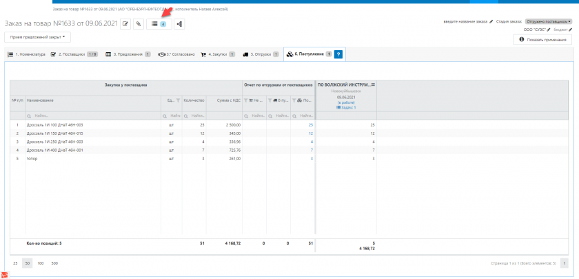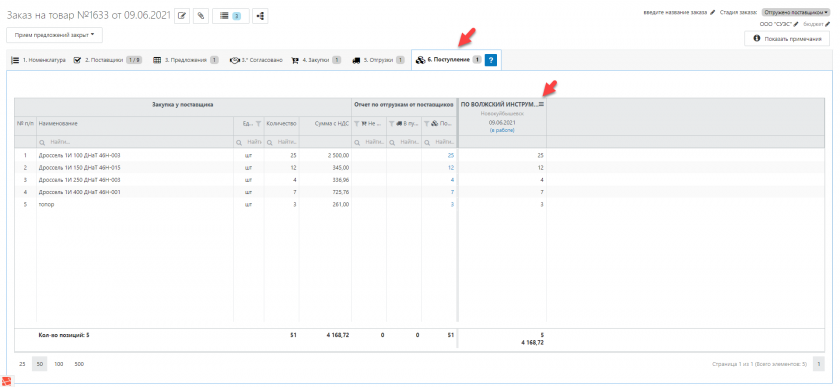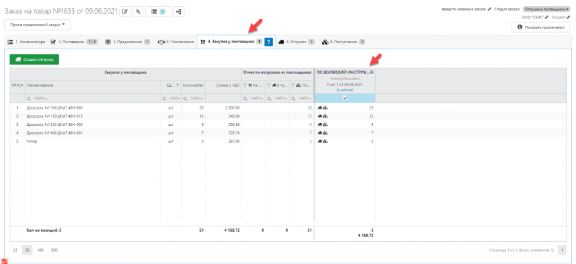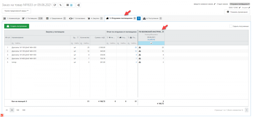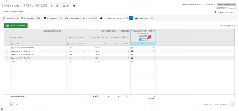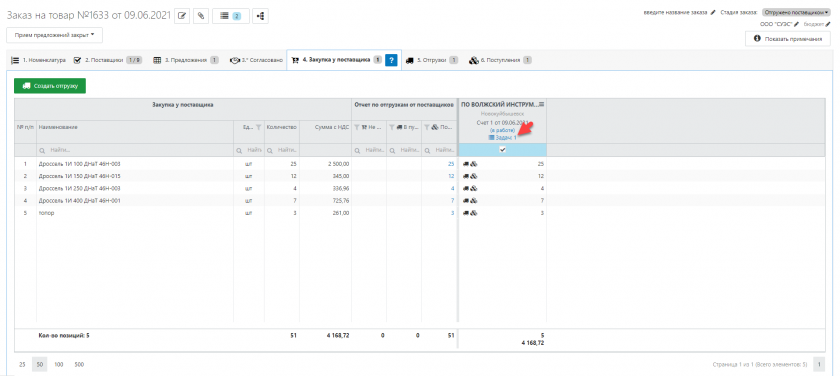 - Задачи, связанные с отгрузкой, можно увидеть на вкладке "Отгружено поставщиком" в шапке столбца с поставщиком