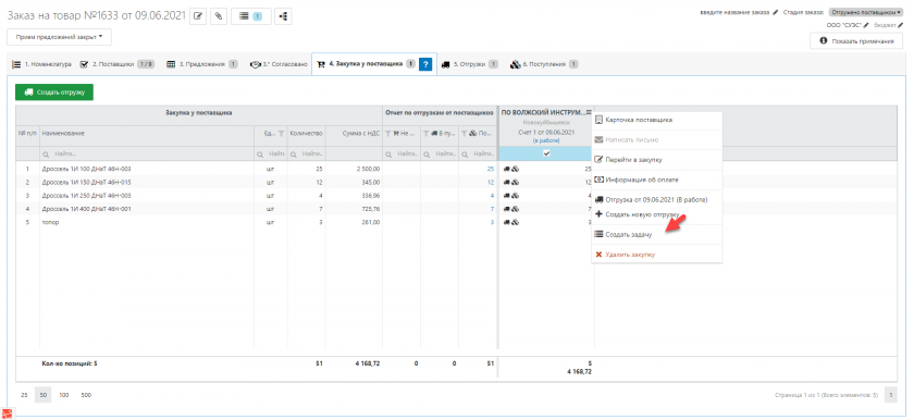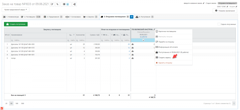 - Для создания задачи, связанной с отгрузкой, перейдите на вкладку "Отгружено поставщиком". Нажмите на меню поставщика