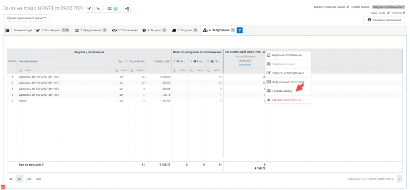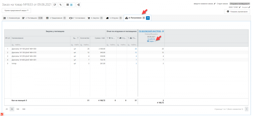 - Задачи, связанные с поступлением, можно увидеть на вкладке "Поступление" в шапке столбца с поставщиком