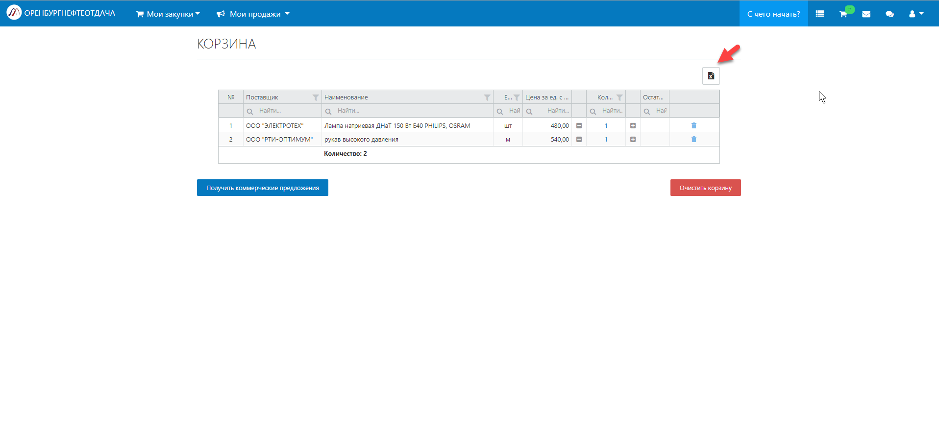• Для того чтобы сохранить заказ в excel нажмите "Экспортировать в Excel"