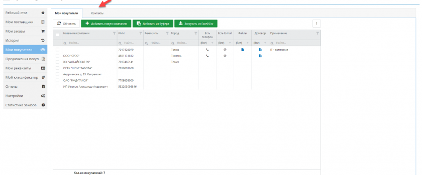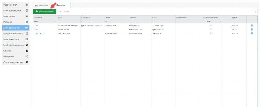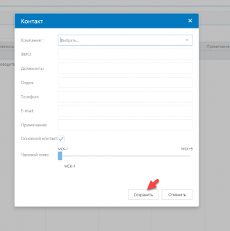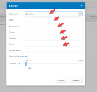 - Выберите покупателя, к которому хотите привязать контакт. Заполните поля : ФИО, должность, отдел, телефон, e-mail и др.
