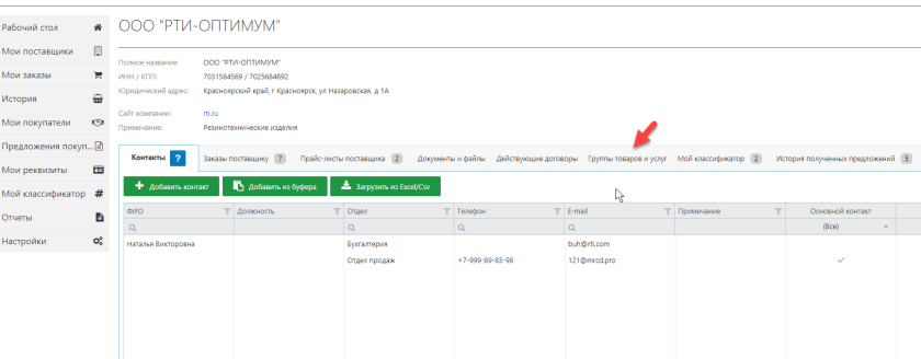 Как добавить контакт в компанию в журнале "Мои поставщики"?