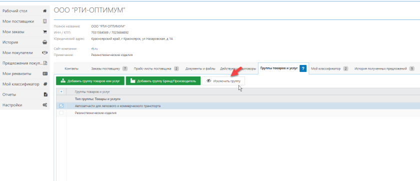 Как исключить добавленную в компанию группу товаров в журнале "Мои поставщики"?