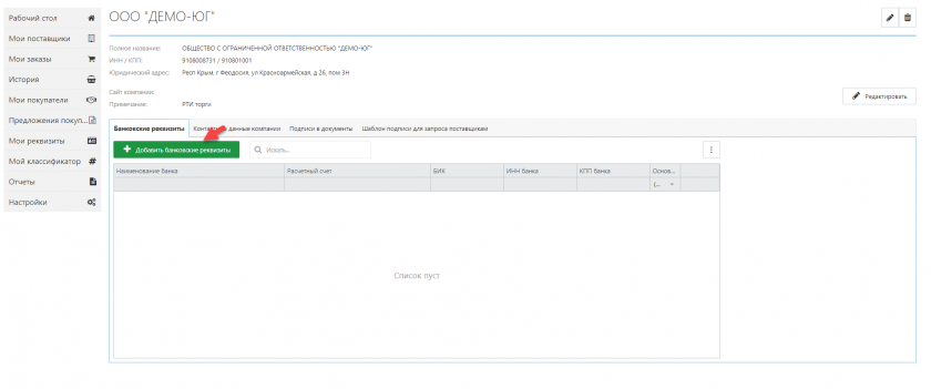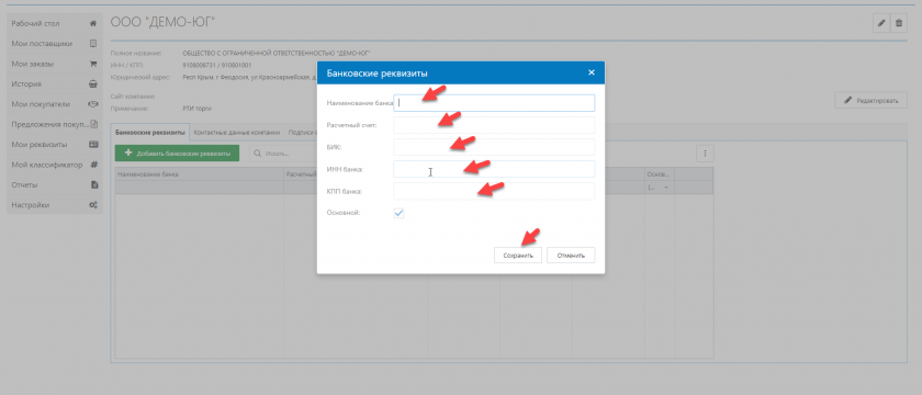 Заполните поля (наименование банка, расчетный счет, БИК и др.) и нажмите "Сохранить"