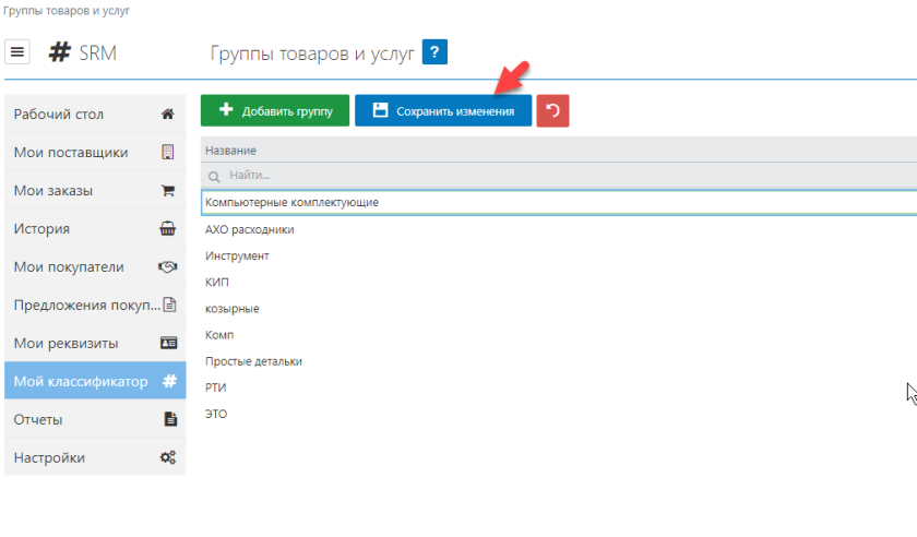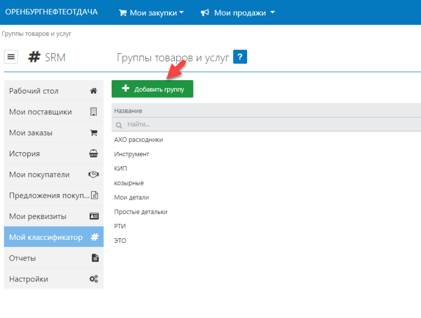 Чтобы создать собственный классификатор для товаров и услуг, нажмите "Добавить группу"