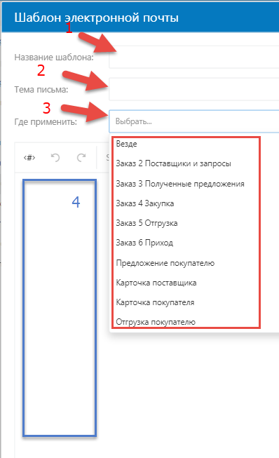 В открывшемся окне вы сможете настроить формат вашего письма, указав как Наименование шаблона (1), Тему письма (2), а так же выбрать место (3), где данный шаблон будет использоваться в Системе. В поле (4) вы сможете внести текст сообщения, которое увидит получатель письма.