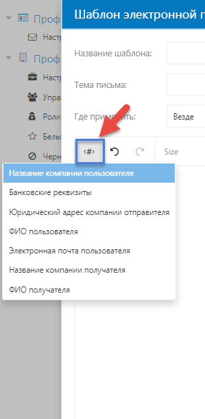 Важно! В тексте письма имеется возможность указывать не только статический текст, но и использовать автоматическое заполнение полей по данным из Системы, которые доступны по клику вот на этот значок:
