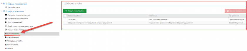 В левой части рабочего окна выбираем раздел Шаблоны писем и кликнув на него попадаем в раздел настройки почтовых шаблонов: