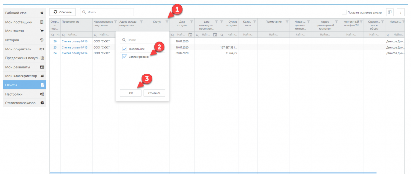 Выберите "Запланировано" в фильтре столбца "Статус" и нажмите "Ок"