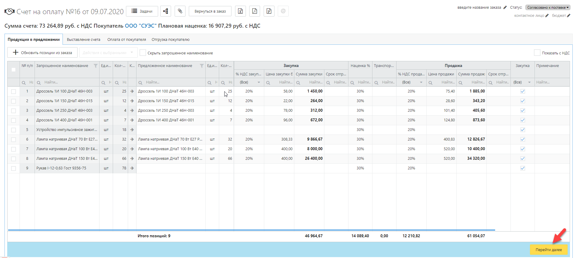 - Во вкладке “Продукция в предложении” выберите нужную номенклатуру