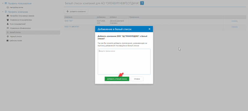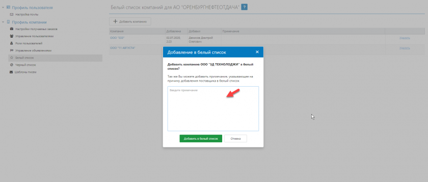 - При необходимости вы можете добавить примечание, указывающее на причину добавления поставщика в белый список