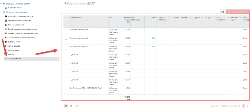 Если файл прикреплен к какому то заказу, поставщику или предожению, то в строке файла в таблице вы увидете номер данного заказа, поставщика или предложения и сможете кликнуть на него, после чего вы сможете перейти в этот заказ, поставщика или предложение: