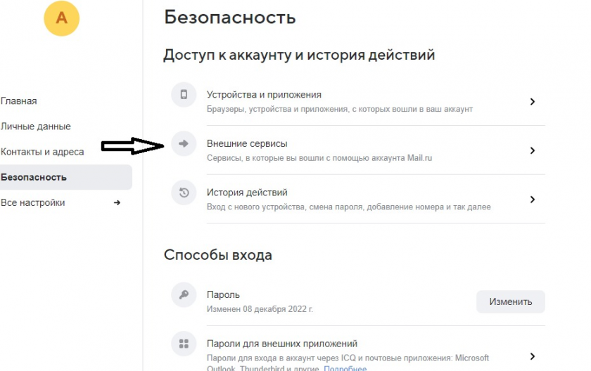 Далее необходимо в разделе безопасность зайти в раздел Внешние сервисы