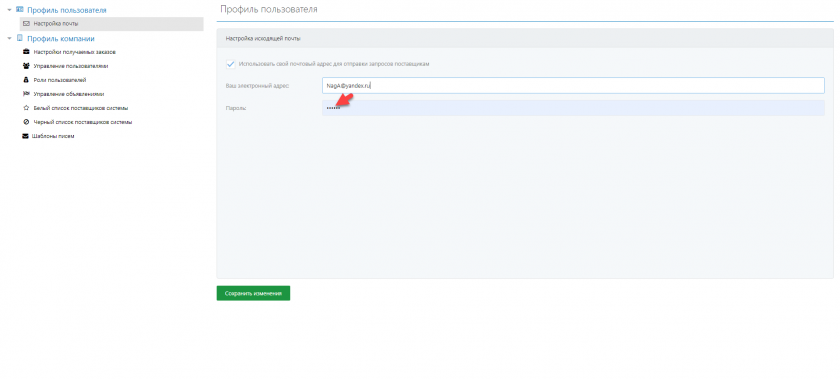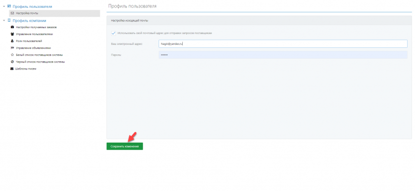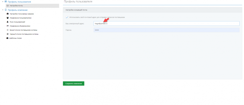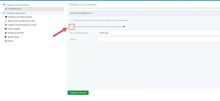 - Поставьте галочку напротив пункта "Использовать свой почтовый адрес для отправки запросов поставщикам"
