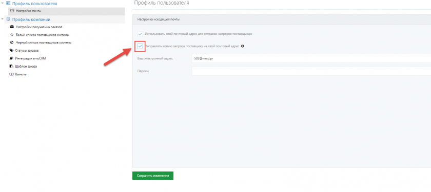 Если вам необходимо чтобы история отправленных из Системы запросов сохранялась в вашем почтовом ящике, просто поставьте галочку внутри чекбокса как на скриншоте ниже, после чего копия исходящих запросов из Системы будет автоматически пересылаться на ваш e-mail.