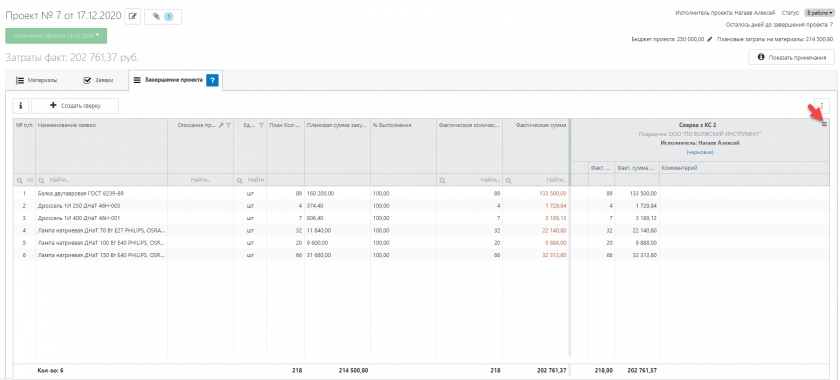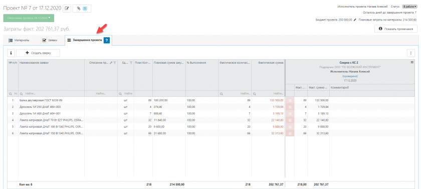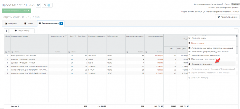 - Выберите проект, в котором хотите отправить на проверку сверку